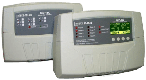 The Weil-McLain BCP-8 is a versatile boiler control panel designed for multi-stage hydronic and steam heating systems. Available in water (BCP-8W) and steam (BCP-8S) models, it manages up to 8 stages and can expand to 24 stages with optional BCP-8X extension modules. Key features include outdoor and system sensors, outdoor cutoff, purge delay, DHW pump relay output, and night setback options.